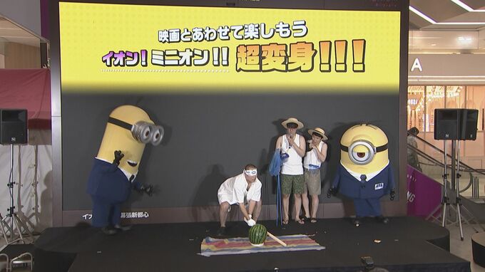 イベント中盤、エージェントミニオンがステージに登場すると、ミニオンたちと夏の思い出を作ろうということで、岡部さんがスイカ割りに挑戦。
