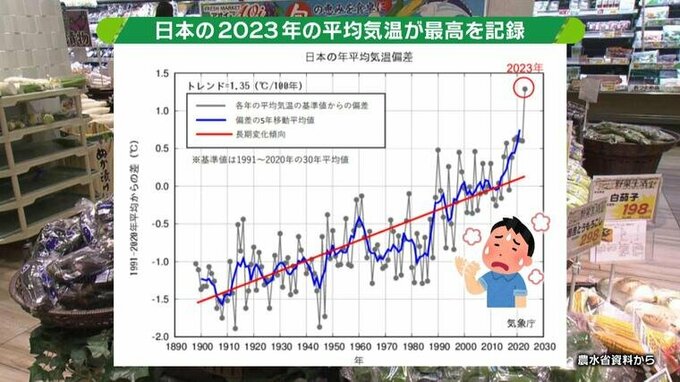 温暖化と野菜事情。日本で野菜は、今まで通り作れなくなるかもしれません。産地が変わったり、収穫時期が変わったり、全て農業ハウス内で作らないといけなくなるかもしれません。そうすると値段が上がってしまう予測も…最前線を専門家など野菜のプロに取材しました。