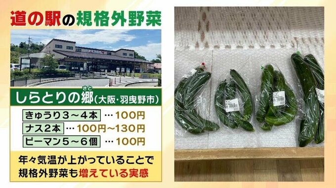 それが道の駅や直売所で売られます。規格を通さないものも置けますので、いつもより量が多く、規格が通らないものが並んでいるんです。大阪府羽曳野市の「しらとりの郷」には、きゅうりが3~4本で100円だったり、ナス2本で100円~130円だったり、ピーマン5~6個で100円だったり、安い商品が並んでいました。