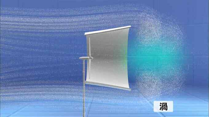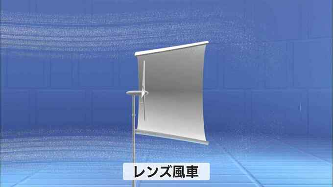 九州大学の大屋裕二名誉教授が、開発を続けてきたレンズ風車。輪っかを付けることで、後ろに「渦」ができて気圧が低くなり、風の流れが速くなるため、羽根が勢いよく回転して発電量が増える仕組みです。
