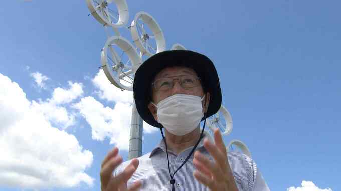 大屋裕二教授「3個よりも5個、5個より7個と、たくさんマルチの輪っか付き風車を並べたほうが風を集めるんですよ。風を集めるから、出力もシングルのレンズ風車の時よりも10%も20%も30%も上がったりするわけですよ」