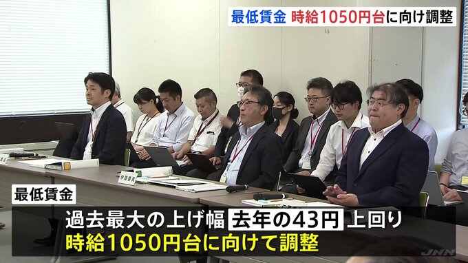 今年度の最低賃金の引き上げをめぐる詰めの議論が行われています。物価高などを踏まえて過去最大の上げ幅となった去年を上回り、全国平均で時給1050円台に向けて調整しています。「最低賃金」は企業が労働者に最低…