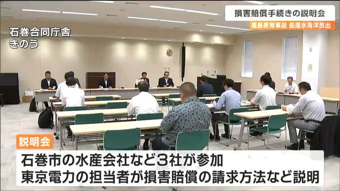 説明会には石巻市内の水産会社など3社が参加し、東京電力の担当者が、損害賠償の請求方法などを説明しました。福島第一原発の処理水は、2023年8月以降およそ5万4700トンが海に放出され、反発した中国は日本の水産物の輸入を全面的に禁止しました。