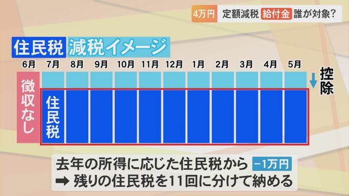 一方、住民税の場合、6月分は徴収されず、去年の所得に応じた住民税の額から1万円を減税。