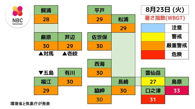 【23日(火) 熱中症警戒アラート】長崎県は「熱中症の危険性が極めて高い気象状況」に 長崎放送 2022年8月22日(月) 16:46 国内 気象庁と環境省は熱中症の危険性が極めて高いとして、長崎県に熱中症警戒アラートを出し、外出をなるべく避け、室内をエアコンなどで涼しい環境にして過ごすよう呼びかけています。 ▼熱中症警戒アラート 23日(火)は、熱中症の危険性が極めて高い気象状況になることが予測されます。 ■予測される 日最高暑さ指数(WBGT) 鰐浦28、厳原30、芦辺29、平戸29、松浦29、佐世保30、西海30、有川30、長崎30、雲仙岳27、島原33、福江29、口之津31、脇岬30 【WBGTの目安】 31~:危険、28~30:厳重警戒、25~27:警戒、~24:注意
