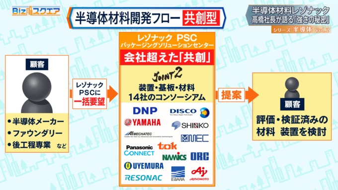 レゾナックが掲げる「共創型」は、これを装置や材料メーカーなど14社でコンソーシアムを作り、その中で施策や検証を行い、不具合のない製品を顧客の要望に先駆けて開発できるようになった。