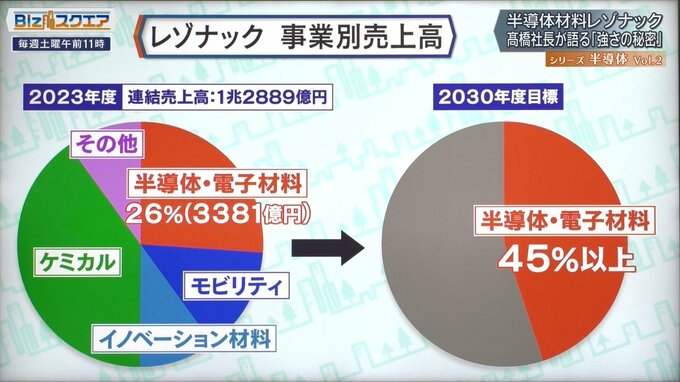 レゾナックは昭和電工と日立化成が合併した会社。今や半導体素材のメーカーに変わりつつある。昭和電工のときは石油化学などが主な事業だったが、2023年1月に旧日立化成と統合した。レゾナックとして発足した後は半導体電子材料、モビリティイノベーション材料などで事業の半分を占めている。また2030年度には半導体電子材料を45%まで引き上げるとしている。