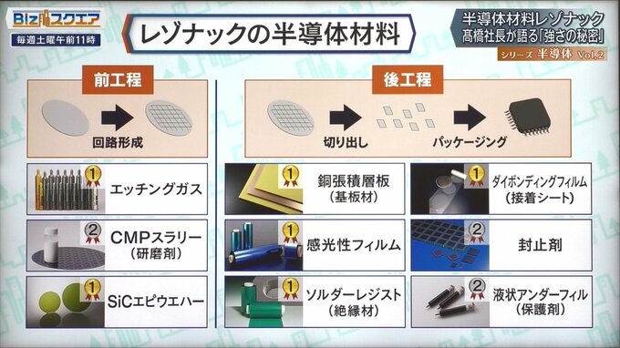 材料メーカーも半導体の後工程の材料で「15」ぐらいあるが、そのうちレゾナックは10個持っているという極めて特徴的なポートフォリオ。それもそれぞれがマーケットシェア世界1位か2位。技術的にもプルーヴン(証明済み)な製品を持っていると。持っていない5つの材料などの方が入っていて、プラス装置なので我々のゴールは半導体メーカーに私たちの材料を売ることで、彼らのゴールも自分の装置を売ること、自分の材料を売ることなので、競合関係にはならない。