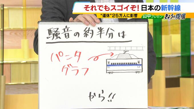 騒音対策も進化を遂げてきました。新幹線の騒音の約半分は実は「パンタグラフ」から出ているといいます。最初は16両編成で8基あったパンタグラフですが、技術の進歩で今では2基まで減らしてるそうです。