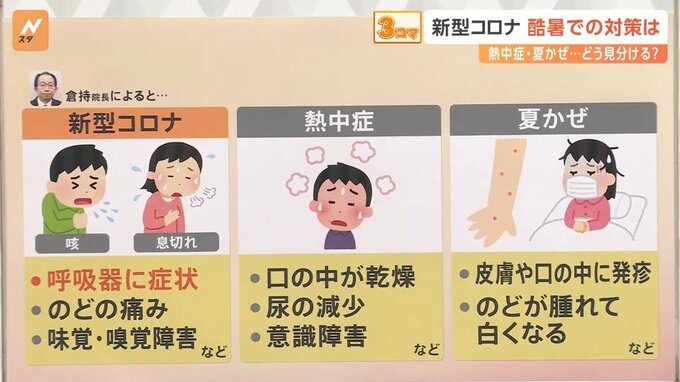 そして具合が悪くなると、今は新型コロナウイルスか、熱中症か、夏かぜか悩む方が多いと思います。発熱、けん怠感、頭痛、ふらふらして歩けないなど、初期症状は似ていますが、やはりそれぞれ特徴があります。