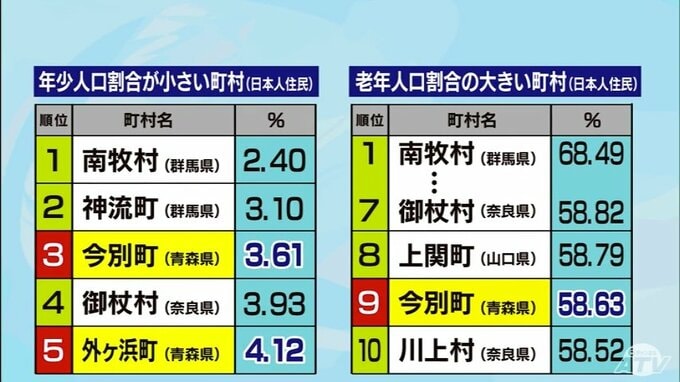 また、県内で最も少子高齢化が進んでいるのが今別町で、全国の町と村での15歳未満の人口の割合が3番目に低く、65歳以上の人口の割合が9番目に高くなっています。