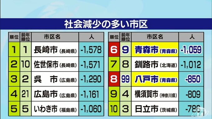 社会減少数が多い市と区では全国で青森市が6位、2023年は99位だった八戸市は大幅に順位が引き上がり、8位となっていて、県内トップの人口を誇る2つの市から流出していることが明らかとなりました。