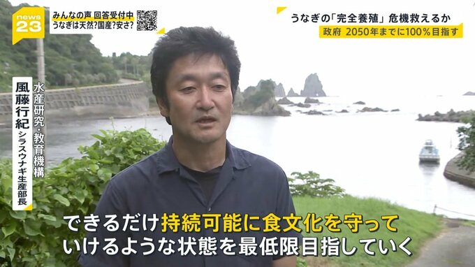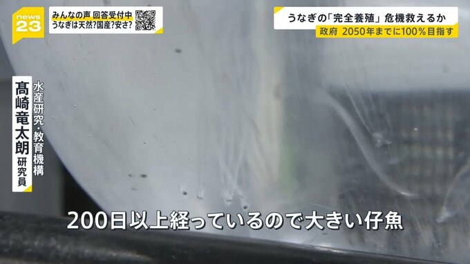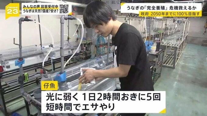 政府は1匹あたり1000円程度まで下げ、2050年までには養殖に使うシラスウナギを100%人の手で育てることを目指しています。