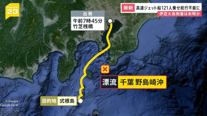 船を運航する東海汽船によると、 船は24日午前7時45分に東京の竹芝桟橋を出発し、伊豆諸島の式根島に向かっていました。しかし、途中で航行できなくなり、千葉県の野島崎沖の南西で漂流していたのです。