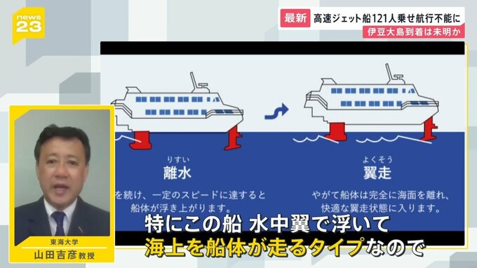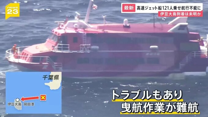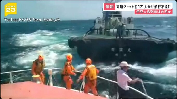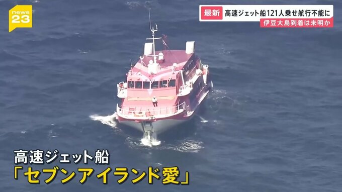 乗客乗員あわせて121人を乗せた高速ジェット船が東京から伊豆諸島へ向かっている最中、自力での航行ができなくなりました。海上保安庁の巡視船などが、えい航を続けていますが、体調不良を訴えている人もいるということです。