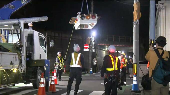 「作業開始からおよそ30分、信号機がついに地面に下ろされていきます」