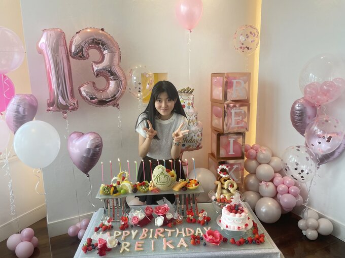 そして、「誕生日ケーキ」と題してケーキやフルーツと13本のロウソク、HAPPYBIRTHDAY REIKAのクッキーと共にピンクに装飾された壁を背景にピースしている麗禾さんの写真を投稿。