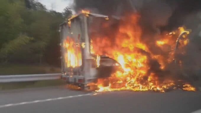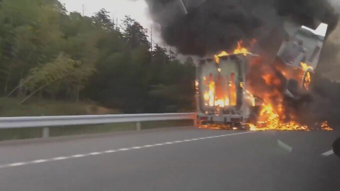 激しい炎と黒煙に包まれたトラック。警察によりますと、25日午後3時50分ごろ、新東名高速上り線・新城インターチェンジ付近で、大型トラックの運転手から「トラックから火が出た」と通報がありました。