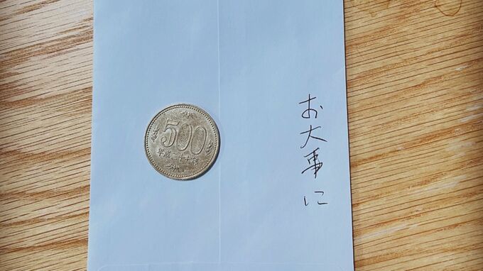 空っぽになったかごの中に、「お大事に」と書かれた封筒と共に500円玉が入っていました。