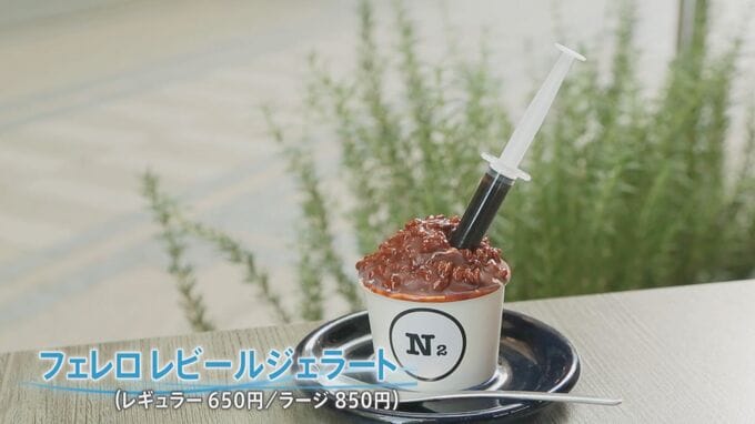 ちなみに「フェレロレビールジェラート」(レギュラー650円/ラージ850円)も人気。注射器のインパクトが絶大なひと品。