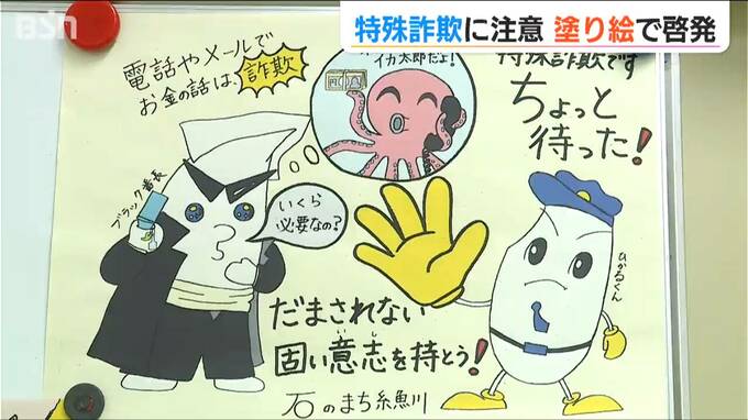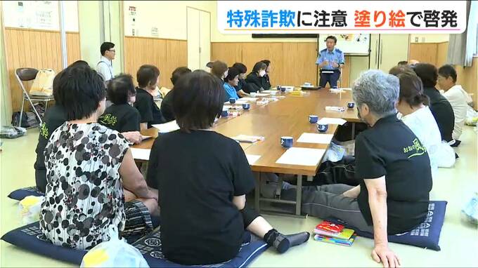 塗り絵を通じて幅広い世代に注意を促そうと企画され、被害を防止するための講話会も開かれました。
