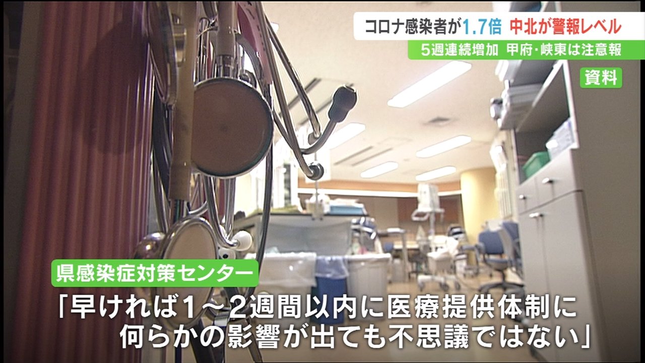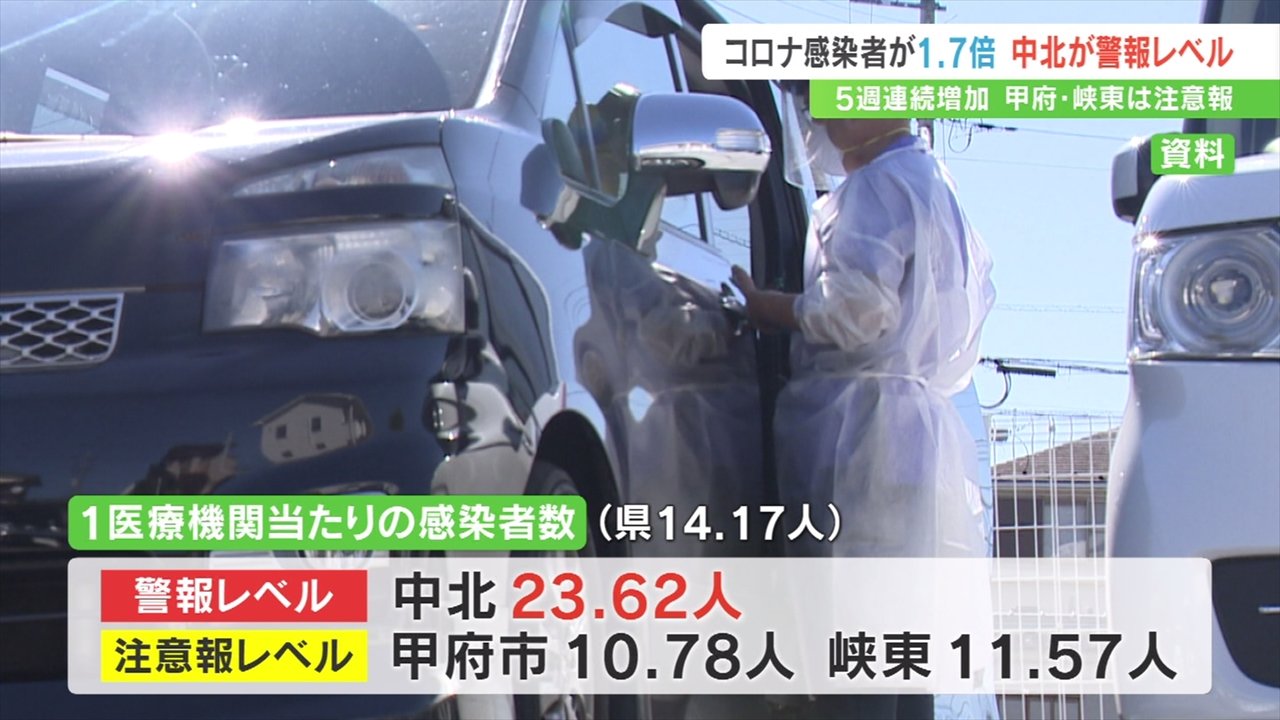 1医療機関あたりの感染者数は県全体が14.17人で、このうち中北地域は23.62人と15人を超え、県は7月25日中北が警報レベルに入ったと発表しました。