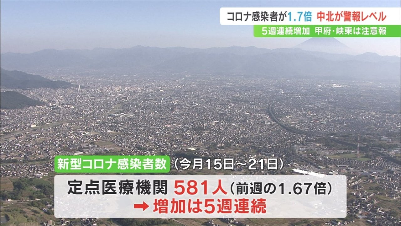 新型コロナウイルスの感染拡大が続き、山梨県内の感染者は前の週の約1.7倍に増えました。