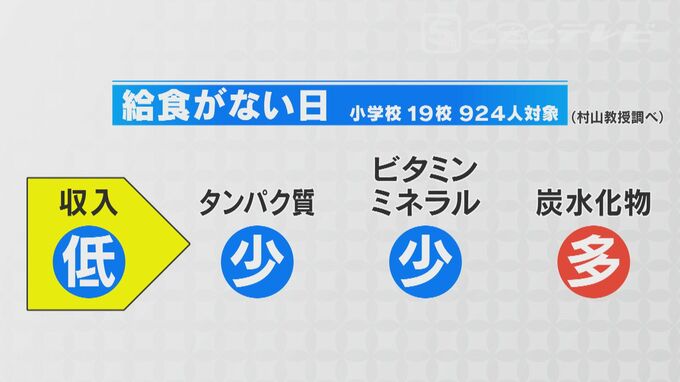 村山教授が小学校19校の924人に行った調査では収入が比較的低い世帯は、そうでない世帯に比べ夏休み中はタンパク質やビタミン・ミネラルの摂取量が少なく、反対に炭水化物が増えるという結果に。