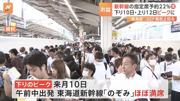 JR各社はきょう、来月のお盆期間の新幹線の予約状況を発表し、指定席の予約数が去年よりおよそ22%増えたことが分かりました。東海道新幹線は初めて、コロナ禍前を上回ったということです。JR各社によりますと、来月…