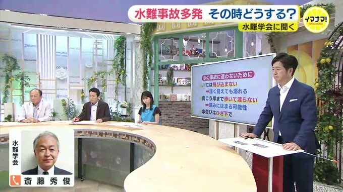 斎藤さん、どうもありがとうございました。ポイントとしては、▽川に飛び込まない。▽向こう岸まで歩いて渡らない。そして、▽水遊びはひざ下でという一つのラインというのが大事になってきそうですね。