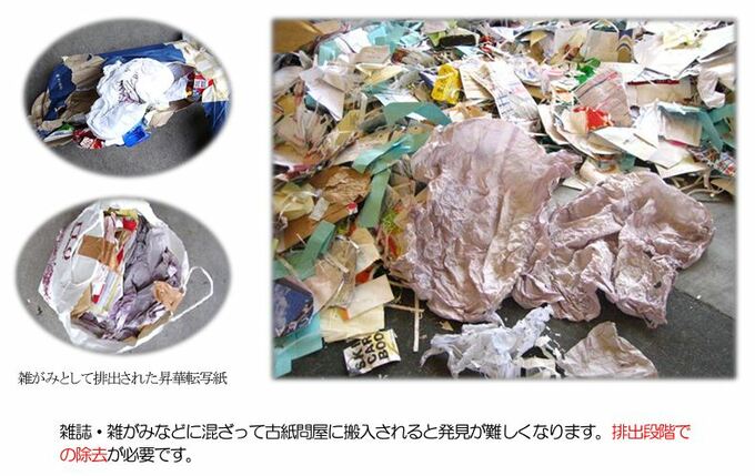 古紙のリサイクルに混入されると、昇華転写紙の側に残ったインクが再生紙側に移って「使用に堪えられなくなる」とされており、公益財団法人 古紙再生促進センターでは「A4サイズ1枚の昇華転写紙が混入すると約100 トンの損紙が発生します」「使用済み昇華転写紙が古紙に混入しないようお願いします」と注意を呼びかけています。