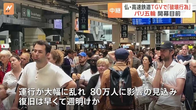 きょうパリオリンピック™が開幕するフランスの国鉄は、広範囲な「破壊行為」があったと発表しました。一部では火災が起き、80万人に影響が出る見込みです。私は今、パリの主要ターミナル駅の一つ、モンパルナス駅…