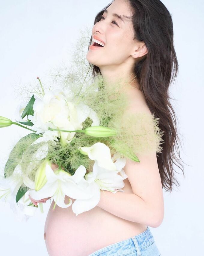 橋本さんは「マタニティ撮影のアザーカット」というテキストに合わせ、デニムを穿き、着衣無しの上半身に花束を抱えた写真を投稿。ロングヘアが背中側に柔らかに流れ落ち、橋本さんの朗らかな笑顔が印象的な写真です。