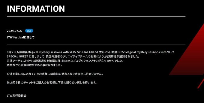 公式サイトでは「8月2日斉藤和義Magical mystery sessions with VERY SPECIAL GUEST 並びに5日銀杏BOYZ Magical mystery sessions with VERY SPECIAL GUEST に関しまして、英国共演者のクリエイティブチームの判断により、共演辞退が通知されました。」と、投稿。