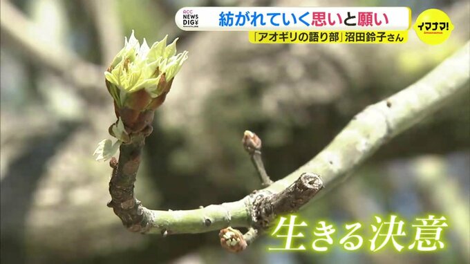 生きる希望をなくした沼田さんを救ったのは、“同じ場所” で被爆したアオギリでした。原爆に遭いながらも新しい緑の葉を出したアオギリを自分自身と重ね合わせ、生きる決意をします。