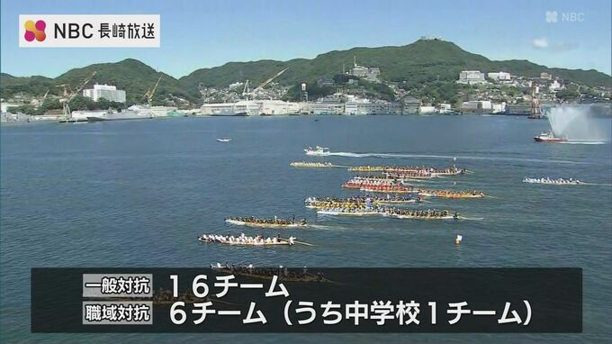 長崎市で28日、長崎ペーロン選手権大会が行われ野母崎が3連覇を達成しました。長崎の夏の風物詩「長崎ペーロン選手権大会」去年に続き、1日のみの開催で一般対抗レースに16チーム。職域対抗レースに中学校1チーム…