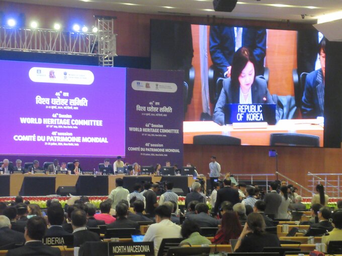 新しい世界遺産が誕生すると、その国の代表団が4分のスピーチを行うのが通例です。今回も日本政府代表団が英語でスピーチし、「特に朝鮮半島出身労働者を誠実に記憶に留めつつ、韓国と緊密に協議しながら『佐渡島の金山』の全体の歴史を包括的に扱う説明・展示戦略及び施設を強化すべく引き続き努力していく」と述べました。