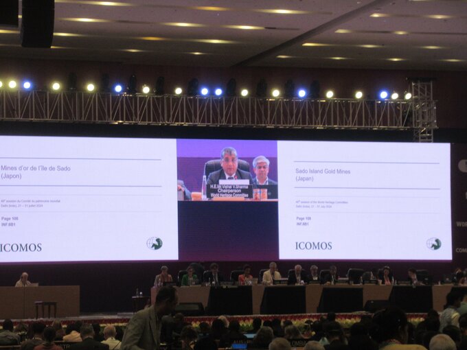 注目の「佐渡島の金山」は27日の朝一番、委員会のその日最初の審議となりました。まずICOMOSが「佐渡島の金山」の概要を説明し、「追加の情報が必要」という事前評価に至った理由を説明します。