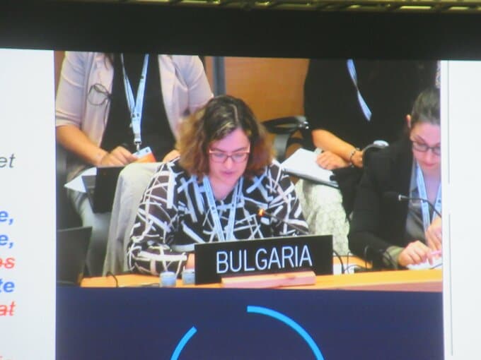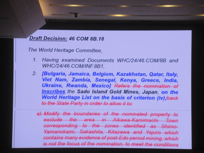 続いてブルガリアの政府代表団が修正案について説明。同時に「なぜ『佐渡島の金山』が世界遺産にふさわしいか」についても説明していきます。さらに、ブルガリアの他にもこの修正案に賛成する委員国の国名が、決議文の中に青い字で加筆されていきます。