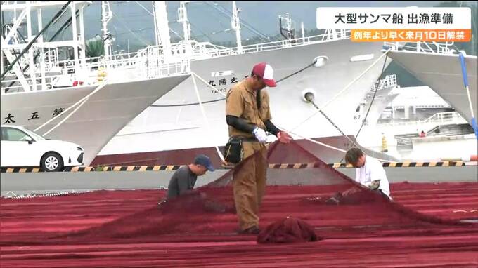 全国有数のサンマの水揚げ基地、気仙沼港では、午前7時頃から大型サンマ船の乗組員が漁で使用する網を修復するなど出漁に向けた準備をしていました。