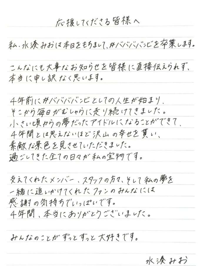 水湊さんは、「応援してくださる皆様へ」と書き出し、「私、水湊みおは本日をもちまして、#ババババンビを卒業します」と発表。「こんなにも大事なお知らせを皆様に直接伝えられず、本当に申し訳なく思います」と、直筆のコメントを掲載し、謝罪しました。