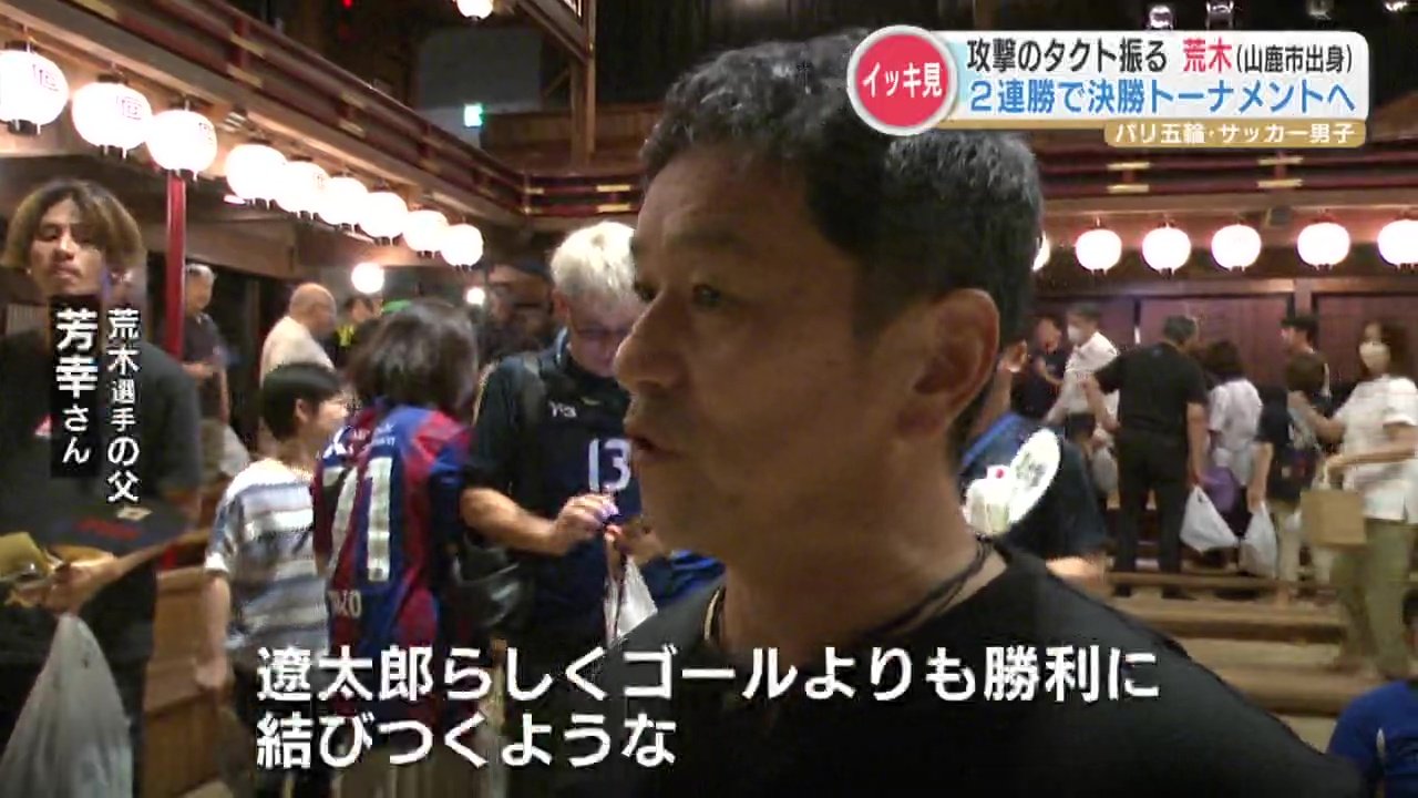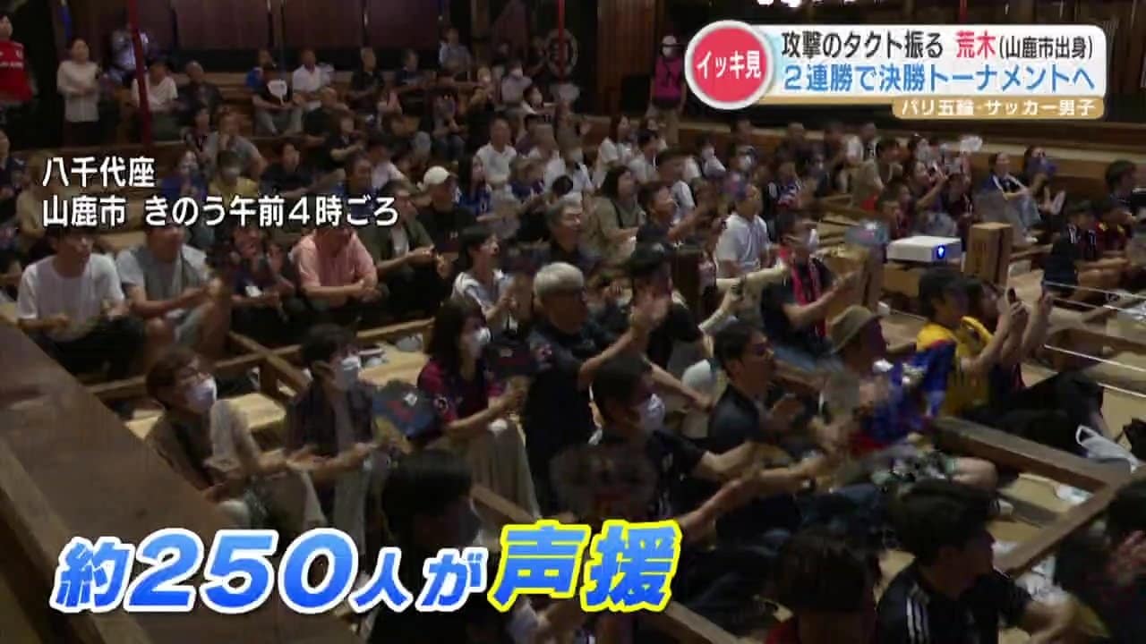 熊本県山鹿市出身の荒木遼太郎(あらき りょうたろう)が今大会初スタメンを飾った、サッカー男子の1次リーグ第2戦。地元・山鹿市では、父・芳幸(よしゆき)さんをはじめ約250人が早朝から声援を送りました。