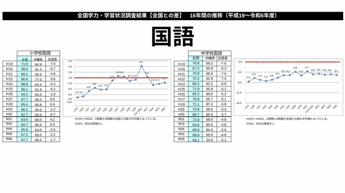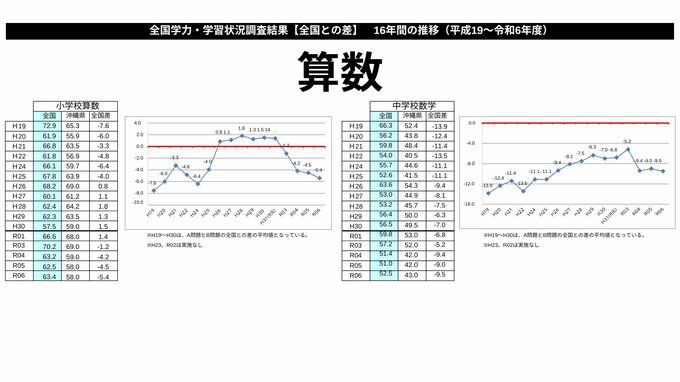 また中学校の正答率は、調査開始以来16年連続で国語・数学ともに全国平均を下回っています。