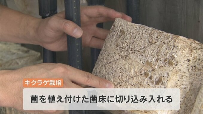 キクラゲの栽培は元となる菌を植え付けた菌床というおよそ20cm四方のブロックに切り込みをいれます。