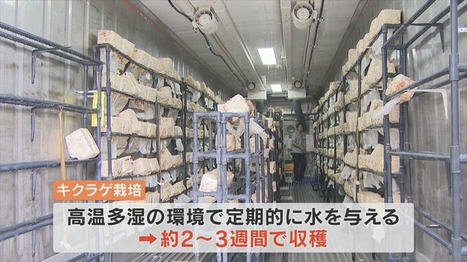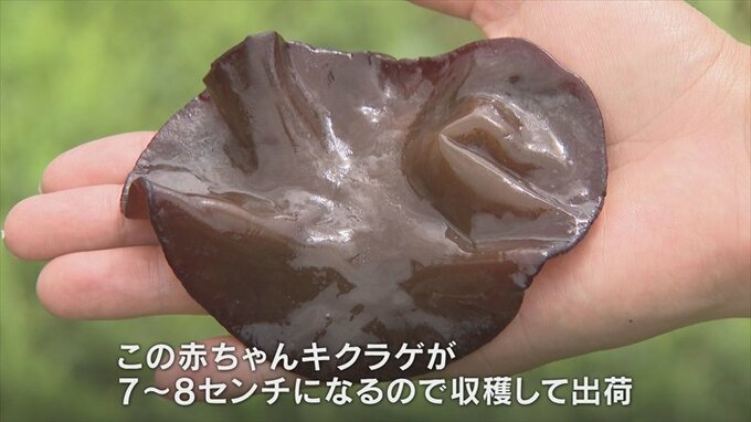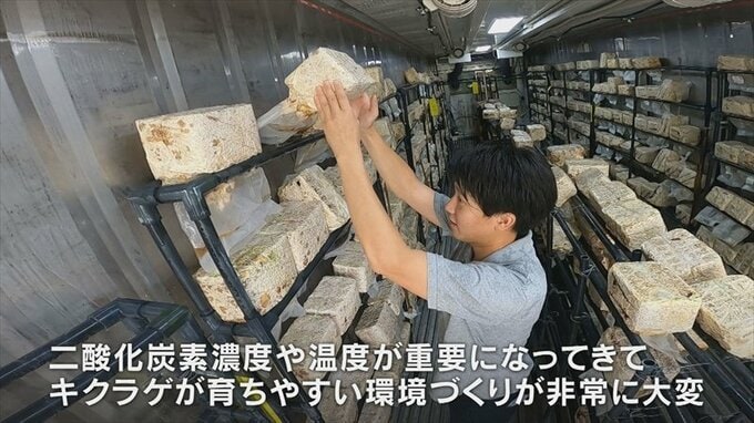 この赤ちゃんキクラゲが少し大きくなると7~8cmになるので収穫して出荷となります。二酸化炭素濃度や温度が重要になってきて、キクラゲが育ちやすい環境づくりが非常に大変なこと。毎日キクラゲの顔色を見ることが必要なのかなと思っています。