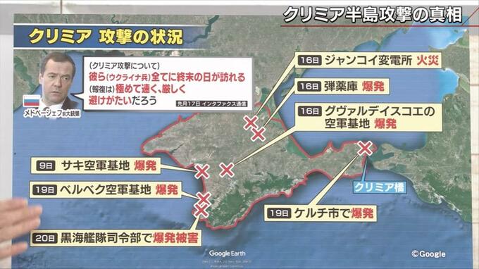 メドベージェフ前大統領はクリミアへの攻撃について、ウクライナに終末の日が訪れると警告し、核使用を匂わせた。アメリカもロシア領への攻撃は良しとせず、ロシア領に届く武器は提供していない。ところが、8月にクリミア半島で謎の爆発が相次いでいる。空軍基地、弾薬庫、変電所・・・。当初、ウクライナ軍も攻撃を表明せず、ロシア側は事故だと報告していた。