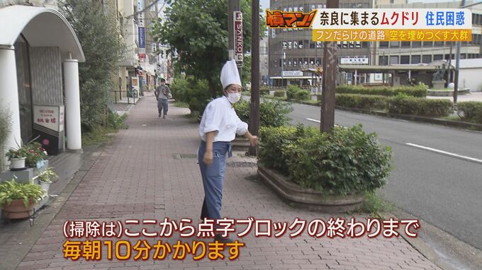 「フンが毎朝すごいので、水で流してデッキブラシでこすって掃除しています。(掃除は)ここから向こうの点字ブロックの終わりまで。毎朝10分かかります」