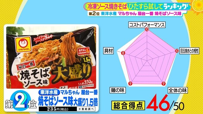 第2位は、東洋水産の『マルちゃん 屋台一番 焼そばソース味 大盛り1.5倍』(税込235円 ※番組調べ)。