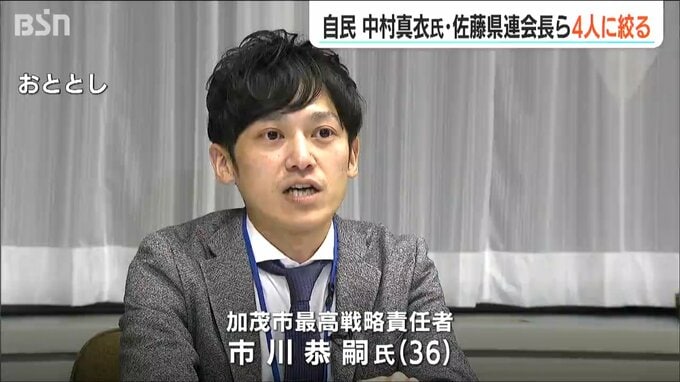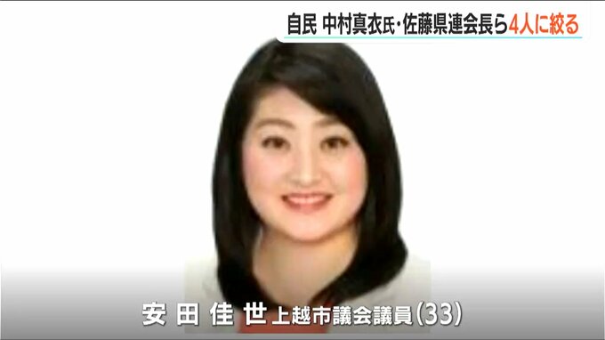 30日には国会議員や県議らが参加して選挙対策委員会が開かれ、書類や面接による選考の結果、受け付け順に、長岡市出身の元競泳選手でスイミングアドバイザーの中村真衣さん(45歳)・自民党新潟県連の会長を務める佐藤信秋参議院議員(76歳)・現在2期目となる安田佳世上越市議会議員(33歳)・加茂市の最高戦略責任者である市川恭嗣さん(36歳)、の4人に絞られたということです。