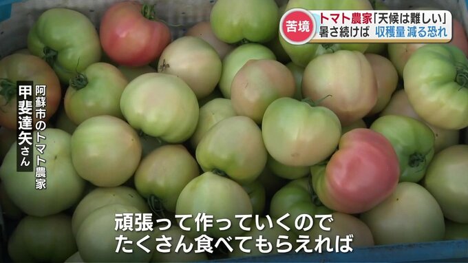 トマト農家 甲斐達矢さん「この先ずっとこの暑さが続けば、トマトの実が太る前に色づいてしまうので、小玉傾向になって収量が減るんじゃないか。出来ればたくさん収穫したいですけど、なかなか天候には難しいので…頑張って作っているのでたくさん食べてもらえれば」